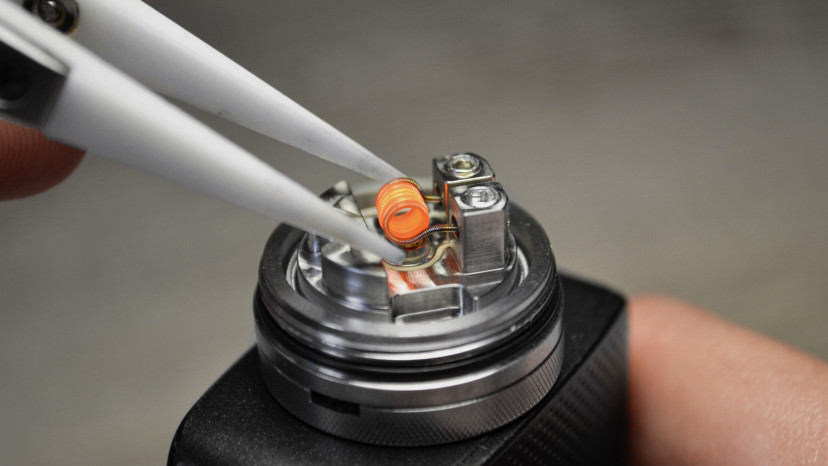 Сначала попробуем запустить атом на тех спиралях, что имеются в комплекте. Для этого нам понадобится снять колечко, затем выкрутить пару винтов на стойках. И сталкиваемся с первой трудностью – ставить койлы теперь не так удобно, так как мешается ограничитель испарительной камеры, из-за чего приходится ножки заранее подгибать.