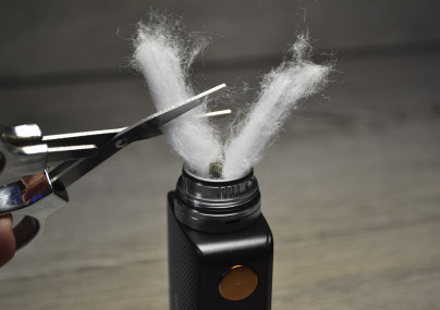 Ставим вату, тут этот процесс малость специфичный. Сначала ее потребуется завести внутрь спирали, а после этого концы поднять вверх, словно кроличьи ушки, и надеть сверху кольцо. В качестве ватки используем знаменитый «Бекон», но можно и любую другую, проблем с жижеподачей тут быть не должно.